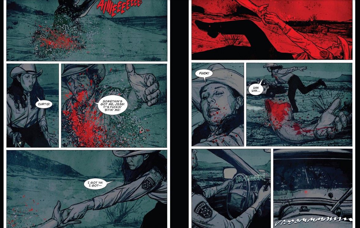 先にJessがAndyに渡したスラーピーを拾い上げる保安官。その身体がいきなり地面に引き込まれ、胴から血が噴き出す。
